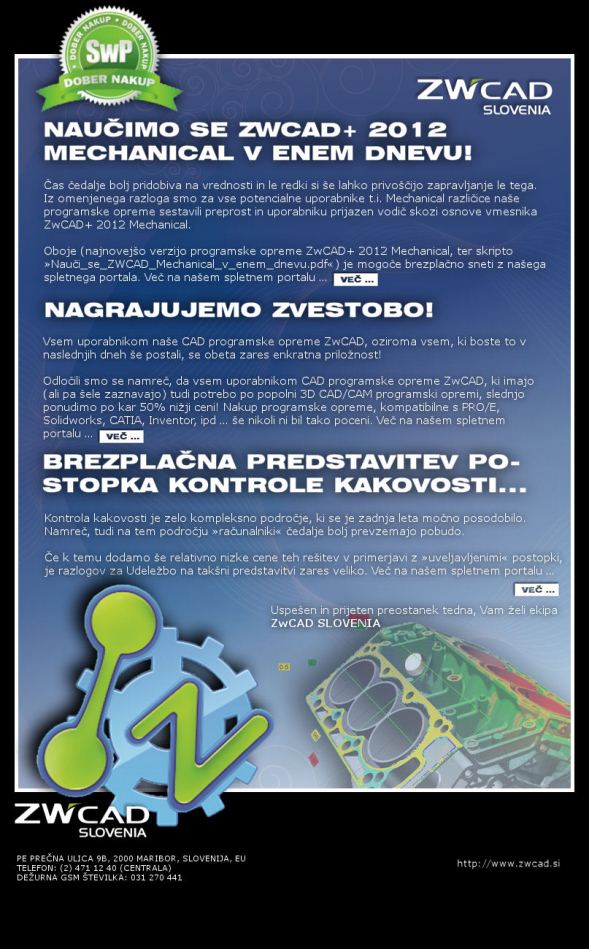 Predstavljamo Mechanical orodje z izredno prijaznim in sodobnim uporabniškim vmesnikom, ter še ugodnejšo ceno. Je primerljiv z Autodesk-ovim proizvodom sorodnega imena, a po neprimerljivo nižji ceni. Preko kratke skripte je orodje mogoče obvladati v enem samem dnevu, prihranek časa pri našem nadaljnjem delu, pa je naravnost navdušujoč. zadeva j vsekakor vredna snetja in testiranja. Uporabniki programske opreme ZwCAD, pa bodo kmalu lahko uporabljali tudi popolno 3D CAD/CAM rešitev, Zw3D, po kar 50% nižji ceni! Več o tem na spletnem portalu ZwCAD SLOVENIA