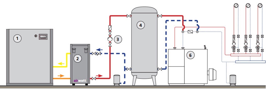 Obstaja več vrst povezav AirWATT z ogrevalnimi sistemi. Primer posredne povezave preko vmesnega zalogovnika: