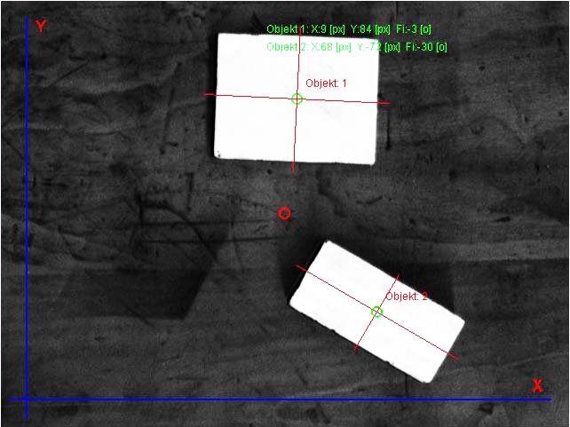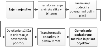 Algoritem temelji na zaznavi in označevanju belih področij na binarnih slikah. To opravimo s funkcijo bwlabel() v programu MATLAB [2]. Ta rutina zazna predmete na binarni sliki z iskanjem povezanih belih pikslov. Po odkritju belih področij smo uporabili bwareaopen() [2] funkcijo za odstranjevanje manjših predmetov in regionprops() [2] za pridobivanje položaja in usmerjenosti zaznanih področij. Zadnji korak je pretvorba teh podatkov iz pikslov v mm, da jih lahko pošljemo v robotski krmilnik. Slika 2 prikazuje blokovno shemo algoritma in prikazane zaznane predmete. Zadnji del algoritma je generiranje podatkovne matrike zaznanih predmetov, ki ga sestavlja indeks objekta, X in Y koordinate središča objekta in kot postavitve objekta glede na koordinatni sistem strojnega vida. Program prikaže zaznane predmete s podatki o predmetu, kot je prikazano na sliki 2.