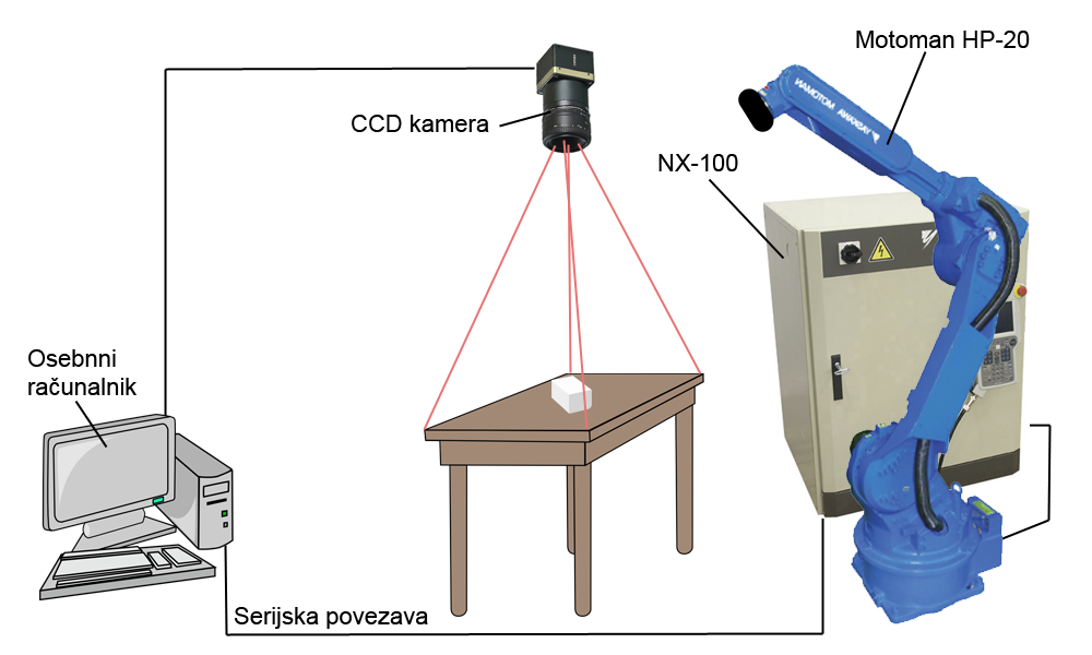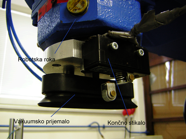 Uporabljen osebni računalnik je uporabljal FireWire komunikacijo za zajem slik iz kamere DMK CCD 21F04. Kamera omogoča zajemanje sivinskih slik z ločljivostjo 640x480 pik, kjer smo z uporabljeno goriščno razdaljo dobili dimenzijo enega piksla, ki znaša 0,653 mm. Industrijski robot, ki smo ga uporabili pri tem testiranju, je bil Motoman HP-20 s krmilnikom NX-100. Odprti serijski nekodirani komunikacijski protokol za krmilnik NX-100 je omejen na hitrost 9600 bit/s in ga ni mogoče spremeniti [1]. Končni efektor robota je vakuumsko prijemalo z mejnim stikalom za zaznavanje predmeta (slika 1 ). Končno stikalo smo uporabili za določitev višine predmeta, ki se je uporabila za določitev načina odlaganja izdelka.