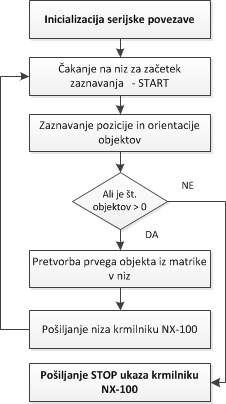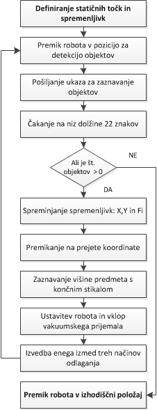 V naslednjem koraku se robot premakne v položaj "zaznavanje objektov", ki ne blokira pogleda kamere na površino z izdelki. Po zaznavi objektov sprejme krmilnik 22 znakov. Ti znaki se logično obdelajo iz njih določi pozicija in orientacija objekta za pobiranje . Robot se premakne v pridobljeni koordinati X in Y in začne s spuščanjem v Z smeri, dokler ga končno stikalo višine ne ustavi. Četrta spremenljivka višina se v tej točki shrani. Nato se vakuumsko prijemalo aktivira in izvede eden izmed treh protokolov za odlaganje. Po uspešnem odlaganju predmeta se robot vrne v položaj "zaznavanje objektov". Če ni zaznanih predmetov, gre v izhodiščni položaj. Shematska predstavitev programa robota je prikazana na sliki 4.