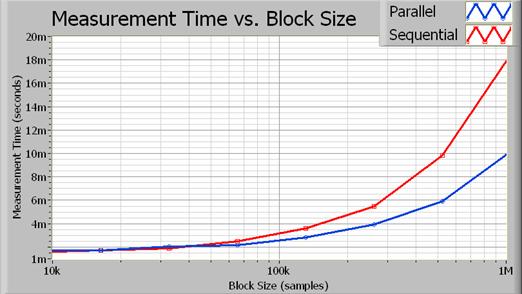 Slika 4. Pri velikostih bloka nad 1 milijon vzorcev (pasovna širina ločljivosti 100 Hz) pomeni vzporedni pristop povečanje zmogljivosti za najmanj 80 %.