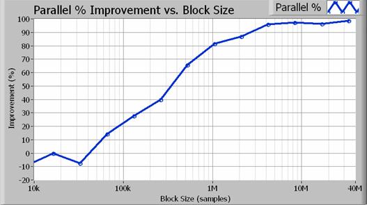 Vzporedni algoritem dejansko dosega dvakratno izboljšanje zmogljivosti pri velikih velikostih blokov. Slika 4 kaže točno povečanje zmogljivosti v odstotkih glede na velikost zajema (v vzorcih).