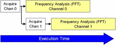 Na sliki 1 se izvaja frekvenčna analiza obeh kanalov z VI-jem FFT Express, ki zaporedoma analizira vsak kanal. Sicer je mogoče zgoraj prikazani algoritem še vedno učinkovito izvajati na večjedrnih procesorjih, lahko izboljšate zmogljivost algoritma z vzporedno obdelavo posameznih kanalov.