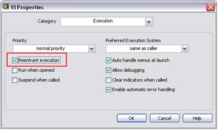 Vzporedna obdelava zahteva, da okolje LabVIEW ustvari kopijo (ali klon) vsakega podprograma za obdelavo signalov. Številni algoritmi za obdelavo signalov LabVIEW so privzeto konfigurirani tako, da omogočajo »izvajanje s ponovnim vstopom«. To pomeni, da okolje LabVIEW dinamično dodeli edinstveno instanco vsakega podprograma, vključno z ločenimi nitmi in pomnilniškim prostorom. Zaradi tega morate podprograme po meri konfigurirati tako, da omogočajo izvajanje s ponovnim vstopom. To lahko storite s preprostim korakom konfiguracije v okolju LabVIEW. To lastnost nastavite tako, da izberete File (Datoteka) >> VI Properties (Lastnosti VI) in izberete kategorijo Execution (Izvajanje). Nato izberite zastavico Reentrant execution (Izvajanje s ponovnim vstopom), kot kaže slika 6.