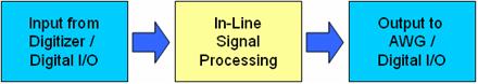 Drugi način uporabe, ki ima korist od tehnik vzporedne obdelave signalov, je uporaba več instrumentov za hkratno pridobivanje in oddajanje signalov. Za takšne aplikacije navadno pravimo, da imajo strojno opremo v zanki (HIL) ali da se obdelava izvaja zaporedno. V tem scenariju lahko za zajemanje signala uporabite hiter digitalizator ali hitro digitalno V/I-enoto. V svoji programski opremi izvedete algoritem za digitalno obdelavo signalov. Na koncu se rezultat ustvari z drugim modularnim instrumentom. Tipičen blokovni diagram je prikazan na sliki 7.