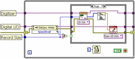 S tradicionalnim pristopom z eno zanko postavite funkcijo branja hitrega digitalizatorja, algoritem za obdelavo signala in hitro funkcijo za zapisovanje v digitalno V/I-napravo v zaporedje. Kot kaže blokovni diagram na sliki 8, se mora vsak od teh podprogramov izvajati zaporedno, kot določa programski model LabVIEW.
