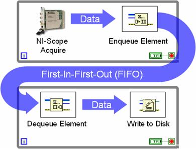Slika 9 kaže tipično zgradbo zank po modelu proizvajalec-porabnik. V tem primeru hitri digitalizator zajema podatke v eno zanki in v vsaki iteraciji poda nov niz podatkov v FIFO. Porabnikova zanka preprosto nadzoruje stanje čakalne vrste in zapiše vsak niz podatkov na disk, ko postane razpoložljiv. Vrednost uporabe čakalnih vrst je v tem, da se zanki izvajata neodvisno druga od druge. V zgornjem primeru hitri digitalizator še naprej zajema podatke, tudi če je prišlo do zakasnitve pri zapisovanju na disk. Odvečni vzorci se ta čas preprosto shranijo v pomnilnik FIFO. Cevovodni pristop po modelu proizvajalec-porabnik na splošno zagotavlja večjo pretočnost podatkov z učinkovitejšim izkoriščanjem procesorja. Ta prednost je še opaznejša pri večjedrnih procesorjih, saj okolje LabVIEW dinamično določa procesorske niti vsakemu jedru.