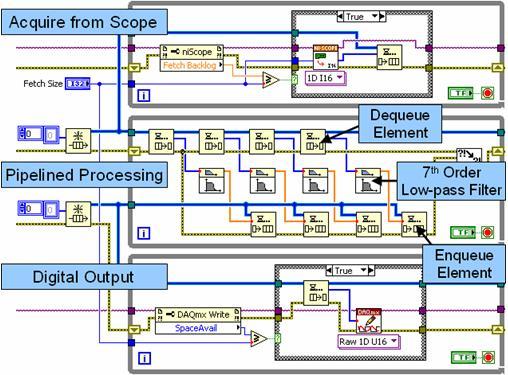 Na sliki 10 je zgornja zanka proizvajalec, ki pridobiva podatke iz hitrega digitalizatorja in jih podaja v prvo čakalno vrsto (FIFO). Srednja zanka deluje kot proizvajalec in porabnik. Med vsako iteracijo prevzame (porabi) več nizov podatkov iz čakalne vrste in jih neodvisno obdela po načinu cevovoda. Ta cevovodni pristop izboljša delovanje večjedrnih procesorjev, saj omogoča neodvisno obdelavo do štirih podatkovnih nizov. Ne pozabite, da srednja zanka deluje tudi kot proizvajalec, ki podaja obdelane podatke v drugo čakalno vrsto. Na koncu spodnja zanka zapiše obdelane podatke v hitro digitalno V/I-enoto.