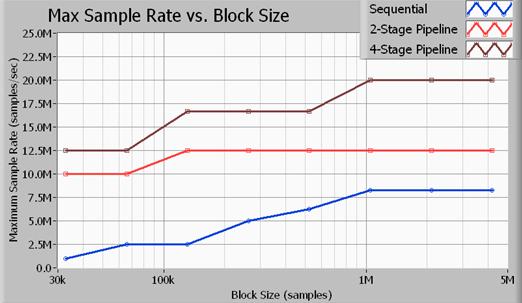 Slika 11 označuje največjo pretočnost v obliki frekvence vzorčenja glede na velikost zajemanja v vzorcih. Vse tukaj prikazane meritve zmogljivosti so bile izvedene s 16-bitnimi vzorci. Poleg tega smo uporabili algoritem za obdelavo signala za Butterworthov nizkoprepustni filter sedmega reda z mejno frekvenco 0,45-kratnika frekvence vzorčenja. Kot kažejo podatki, dosežemo največjo pretočnost podatkov s štiristopenjskim cevovodnim (večzančnim) pristopom. Ne pozabite, da daje dvostopenjski pristop za obdelavo signalov boljšo zmogljivost od enozančne metode (zaporedoma), vendar procesorja ne uporablja tako učinkovito kot štiristopenjska metoda. Zgoraj naštete frekvence vzorčenja so največje frekvence vzorčenja na vhodu in izhodu hitrega digitalizatorja NI PXIe-5122 ter hitre digitalne V/I-enote NI PXIe-6537. Ne pozabite, da pri 20 Mvz/s vodilo aplikacije prenaša podatke s hitrostjo 40 MB/s za vhod in 40 MB/s za izhod, tako da znaša skupna pasovna širina vodila 80 MB/s.