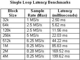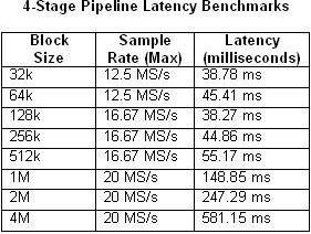 Pomembno je tudi, da upoštevamo, da cevovodna obdelava vnaša zakasnitev med vhodom in izhodom. Zakasnitev je odvisna od več dejavnikov, vključno z velikostjo bloka in frekvenco vzorčenja. Spodnji tabeli 1 in 2 primerjata izmerjeno zakasnitev z velikostjo bloka ter največjo frekvenco vzorčenja za enozančne in štiristopenjske večzančne arhitekture.