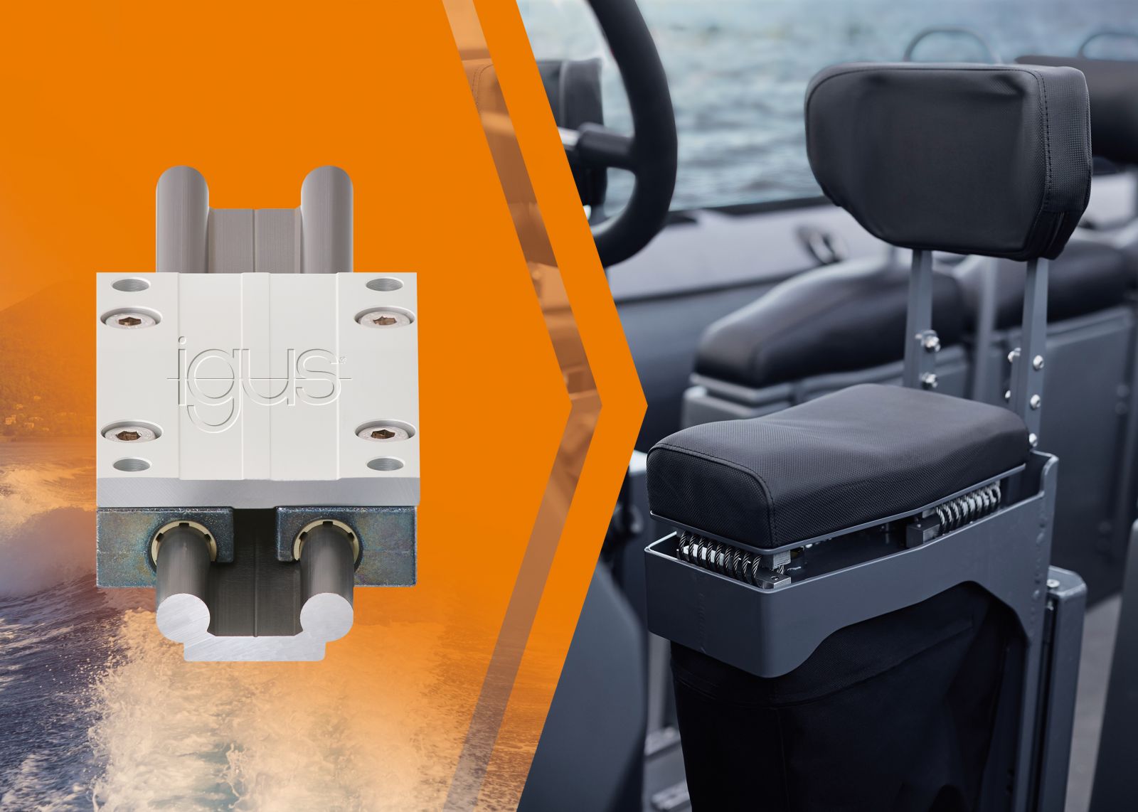 Poljsko podjetje Kaj Naval že sedem let razvija sedeže za motorne čolne. Pri najnovejšem modelu sedeža so oblikovalci uporabili linearno vodilo drylin W za vzmetne blažilce. Vodilo drylin W namreč zagotavlja nežno in enakomerno drsenje ter s tem absorpcijo sunkov valov tudi pri visokih hitrostih. Vozički vodil iz tribopolimerov nimajo zračnosti, zato na delih tudi po dolgem času delovanja ni vidnih znakov obrabe. In še ena prednost: igusova rešitev je odporna proti koroziji, ne potrebuje vzdrževanja in mazanja ter je bistveno lažja od kovinskih alternativ, kot so na primer vodila, ki uporabljajo kroglične ležaje.