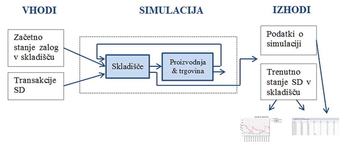 Simulacijski model pretoka SD v skladišču ter predstavljeni kazalniki in grafi so bili določeni v sodelovanju z zaposlenimi iz podjetja. Model je bil po dogovoru razvit tako, da simulacija omogoča preverjanje materialnega toka za poljubno časovno obdobje, lahko za preteklo obdobje ali prihodnje obdobje. Za prihodnje obdobje izvajamo simulacijo ob uporabi napovedanih podatkov o porabi materiala.