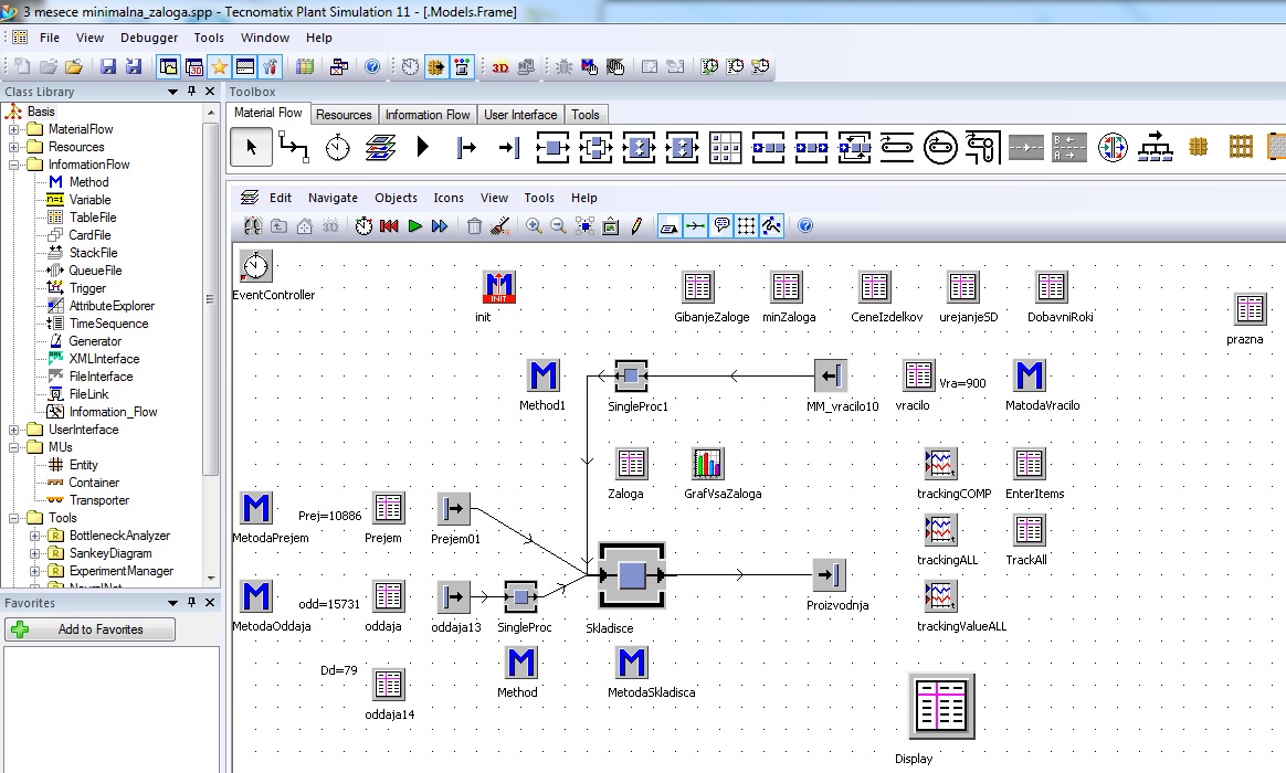 Računalniški model skladišča (Slika 4) smo izdelali v programskem paketu Plant Simulation ([3], [4], [5]). V modelu so enostavne logične odvisnosti proizvodnega procesa popisane s standardnimi objekti programskega paketa, zahtevnejše logične odvisnosti pa z metodami oziroma podprogrami v programskem jeziku SimTalk. Program obsega 32 standardnih objektov programskega paketa in 320 vrstic logičnih odvisnosti, napisanih v programskem jeziku SimTalk.