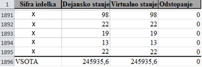 Pravilnost delovanja simulacijskega modela smo preverili tako, da smo po izvajani simulaciji preverjali stanje zalog SD v dejanskem skladišču na določen dan in to primerjali s podatki, ki smo jih dobili pri izvajanju simulacije. Odstopanje količin smo vrednotili v Excelovi tabeli (Slika 5).