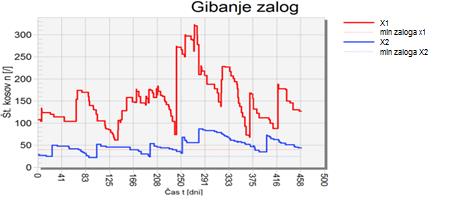 Graf nam izrisuje, kako se je gibala zaloga sestavnega dela v skladišču (Slika 6). Graf izrisuje stanje zalog samo za tiste sestavne dele, ki jih želimo. Za vsak izbrani SD nam graf izriše tudi njegovo trenutno postavljeno mejo minimalne zaloge.