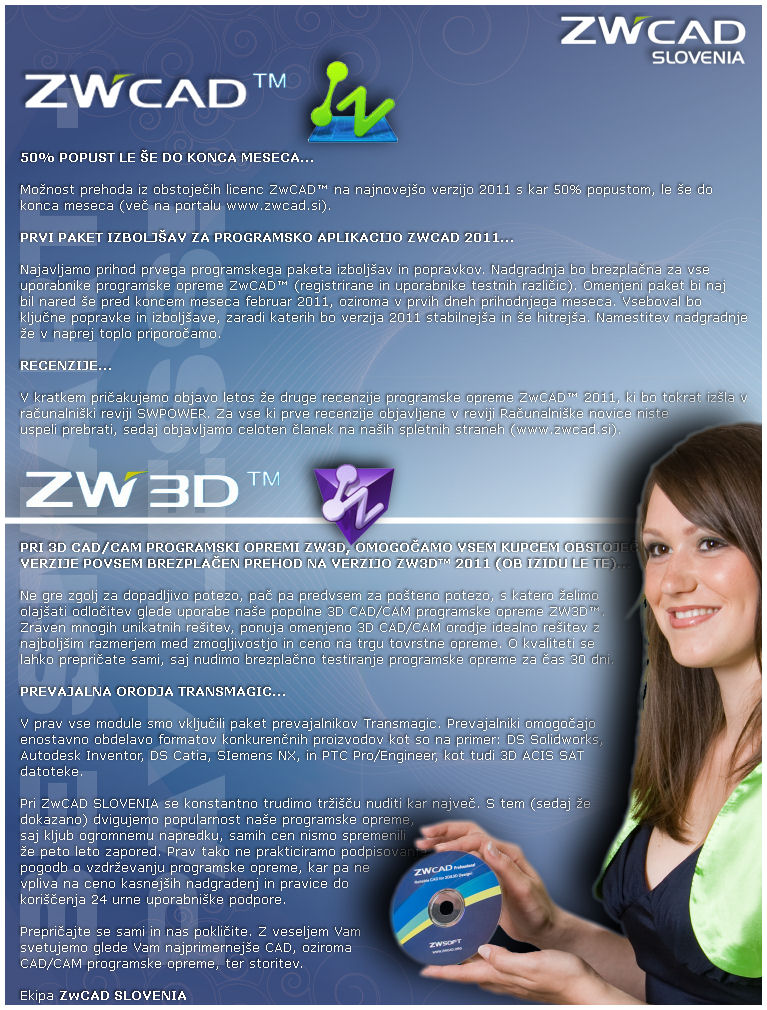 Možnost prehoda iz obstoječih ZwCAD licenc na verzijo 2011 s kar 50% popustom, le še do konca meseca februar 2011...