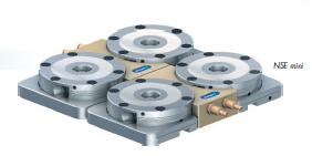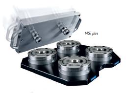 1. NSE plus Standardni modularni hitro izmenljivi paletni sistem z več kot 500 možnimi kombinacijami. Združuje dve temeljni funkciji: centriranje preko kratkega konusa in zaklepanje z dvema vpenjalnima drsnikoma. Vpenjalna drsnika se zapirata s pomočjo vzmeti in sta glede na vpenjalni čep samozaporna. Turbo funkcija uporablja stisnjen zrak in tako poveča moč v predelu z vzmetmi in na površini bata. To poveča vlečno silo do 300 %. Stisnjen zrak pri tlaku 6 bar zadostuje za odprtje vpenjalnih drsnikov. Ko se modul odzrači, vzmeti vpenjalne drsnike avtomatsko premaknejo in modul vpnejo.