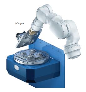 4. NSA plus NSA plus je avtomatizirani paletni sistem - za avtomatizirano proizvodnjo. Modul zagotavlja največjo natančnost za avtomatizirano oskrbovanje stroja. Zelo nizka vgradna višina zahteva zelo malo prostora v delovnem prostoru, izrazita robustnost modula pa zagotavlja zanesljiv prijem, tudi pri grobi obdelavi. Modul zagotavlja, da je ravna vpenjalna površina brez odrezkov, saj ima vgrajeno prisilno spihovanje. Omogoča hitro pozicioniranje in visoko ponovljivost (natančnost) vpenjanja (< 0,005 mm). Sistem je možno opremiti s kontrolo vpetja.