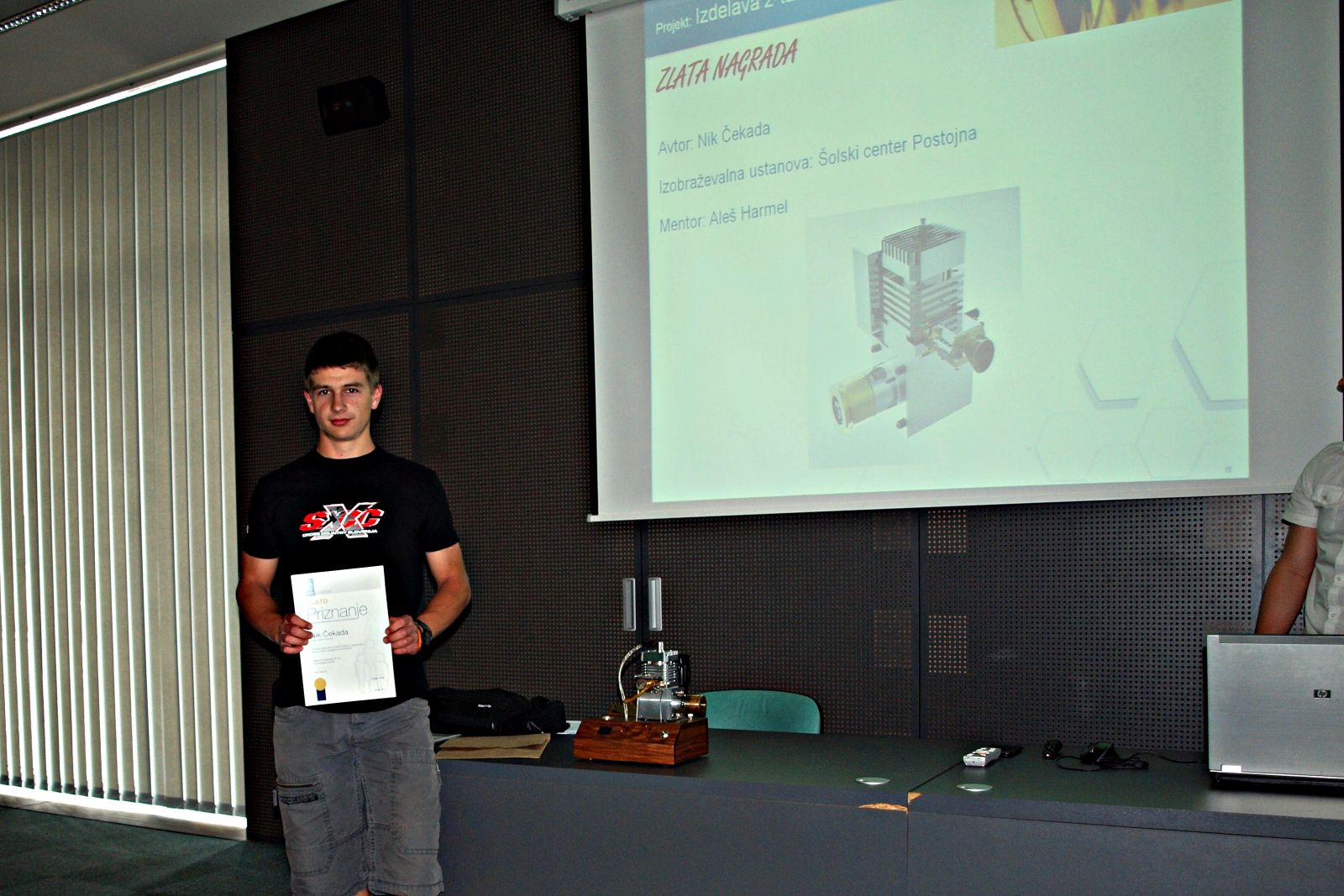 Zlato nagrado in s tem 500€ je prejel Nik Čekada iz Šolskega centra Postojna za projekt »Izdelava 2-taktnega 26 ccm bencinskega motorja« pod mentorskim vodstvom Aleša Hermela.